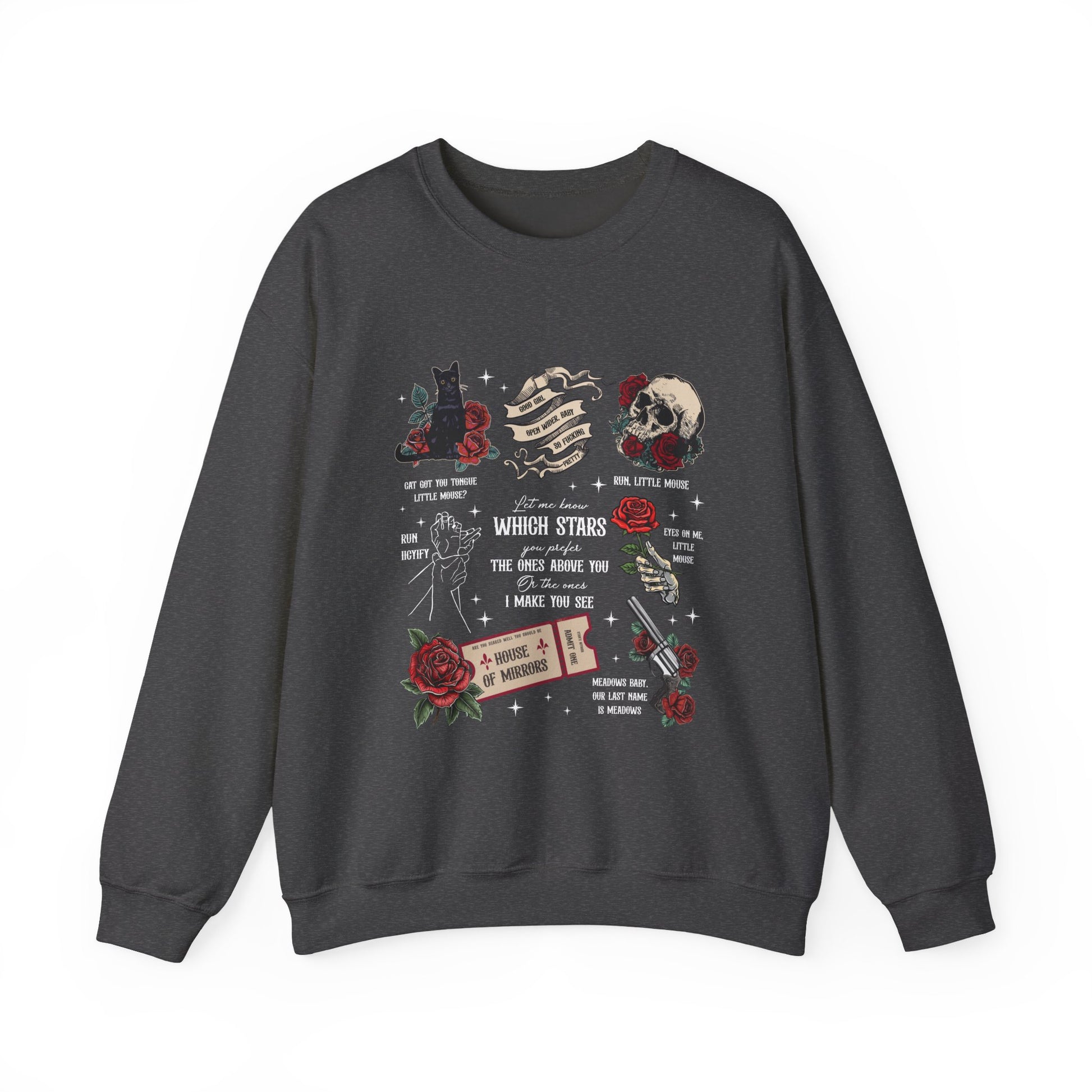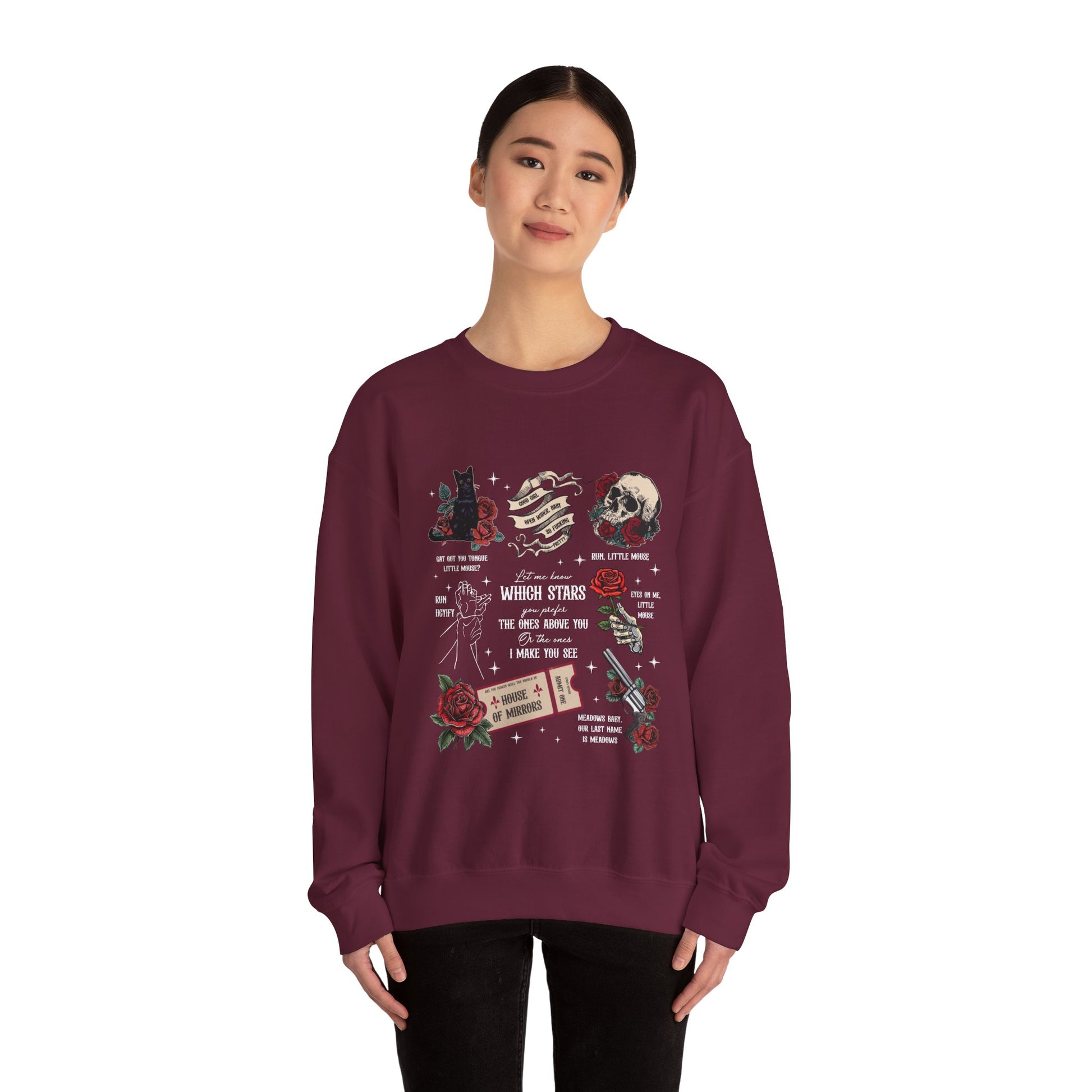 A Haunting Adeline–inspired sweatshirt woven with the lines, tension, and dark little moments that made their story unforgettable. Roses, cats, and those iconic words come together in a design that feels straight out of the Meadows world.